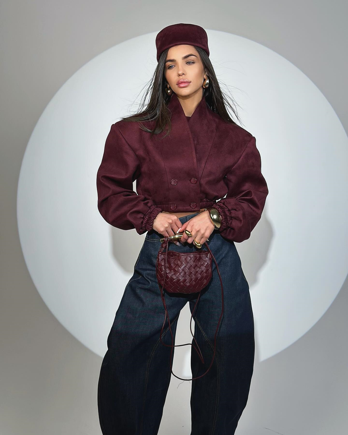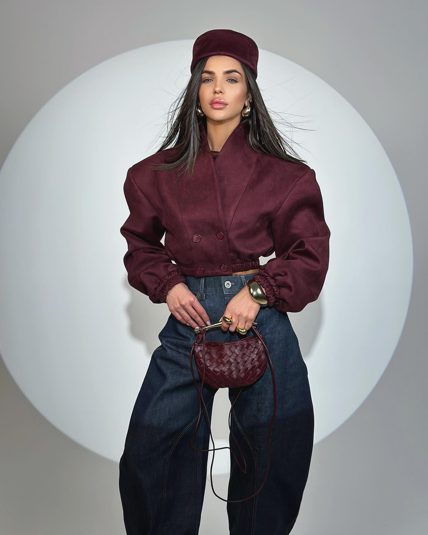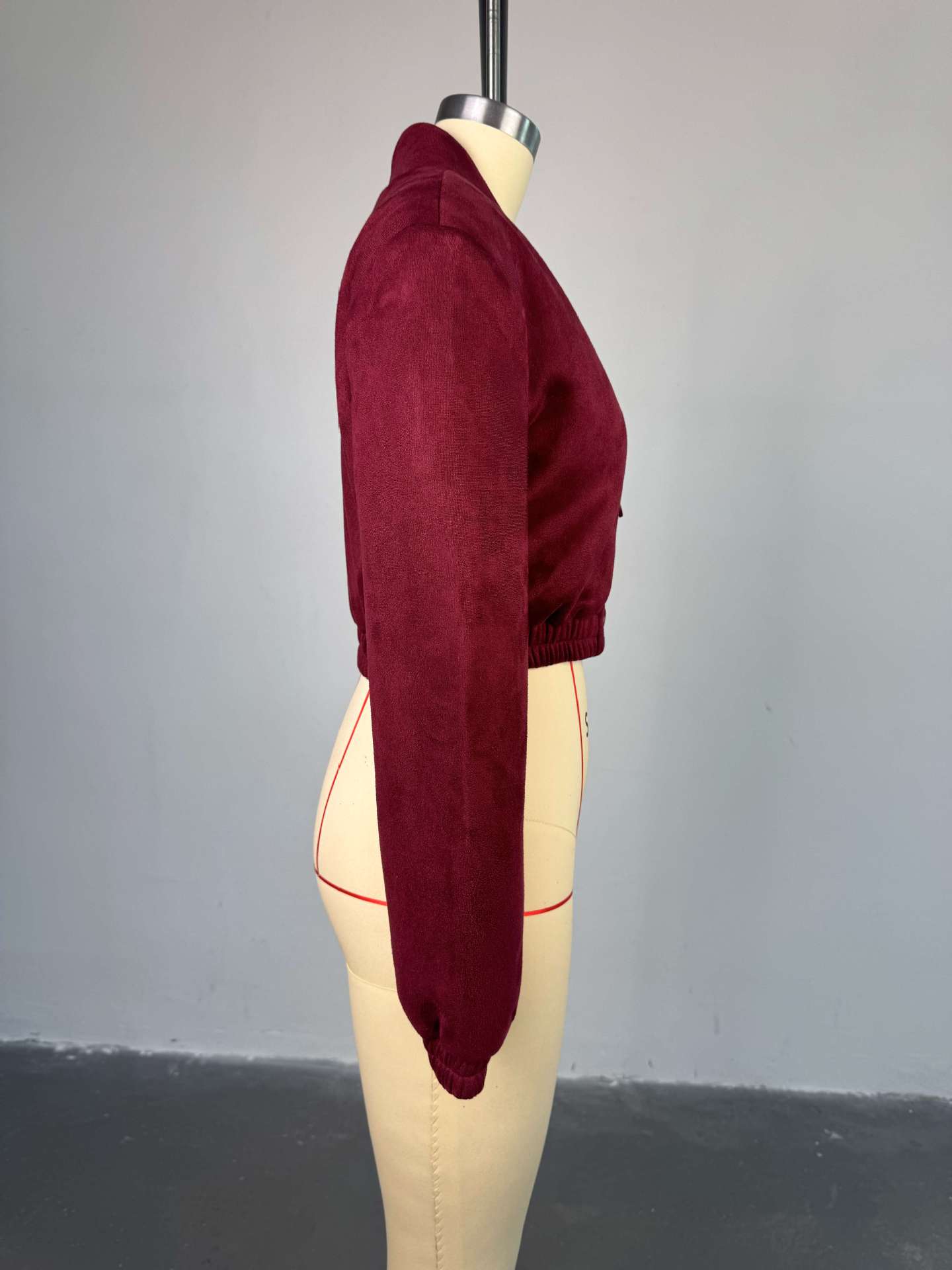 Women's 2025 Spring New Fashion Slim-Fit Wine Red V-Neck Double-Breasted Long Sleeve Short Jacket