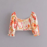 French Retro Printing Bubble Sleeve Pleated Square - Orange / L