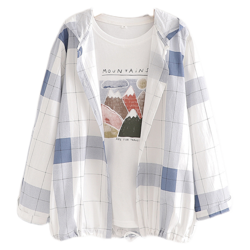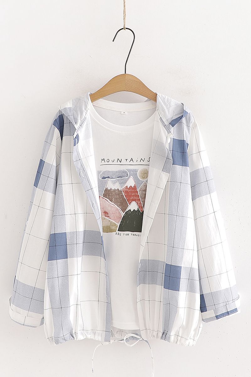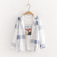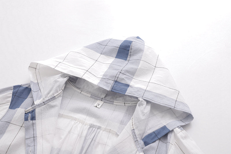 Ladies Plaid Hooded Cotton Linen Long Sleeve Jacket