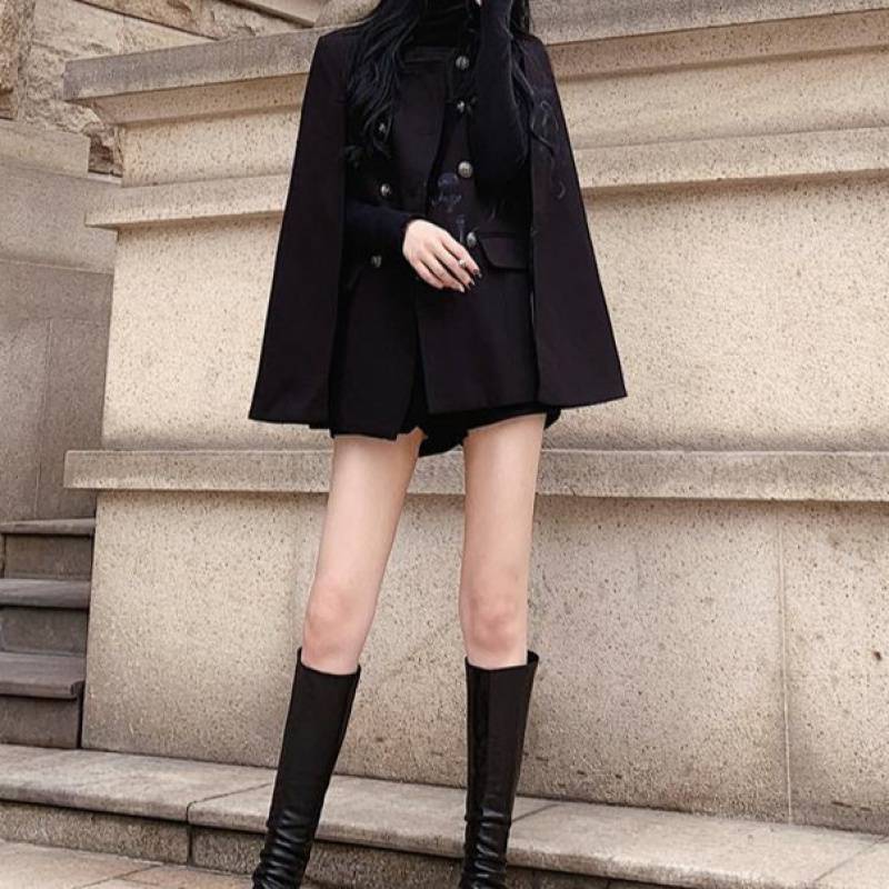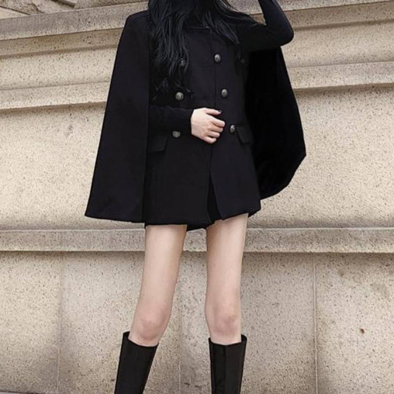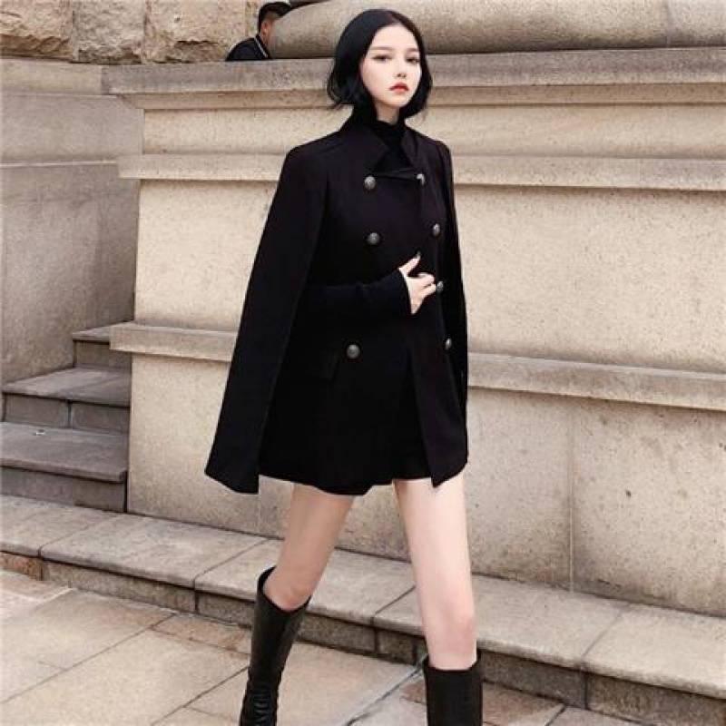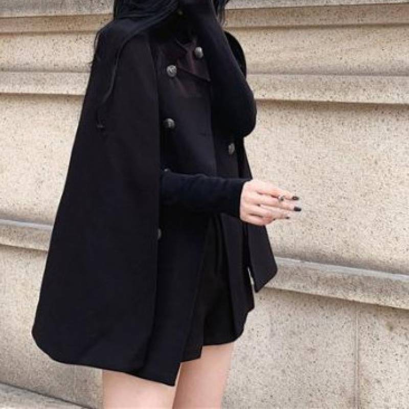 Black Cape Coat Versatile Loose Stand Collar Mid Length