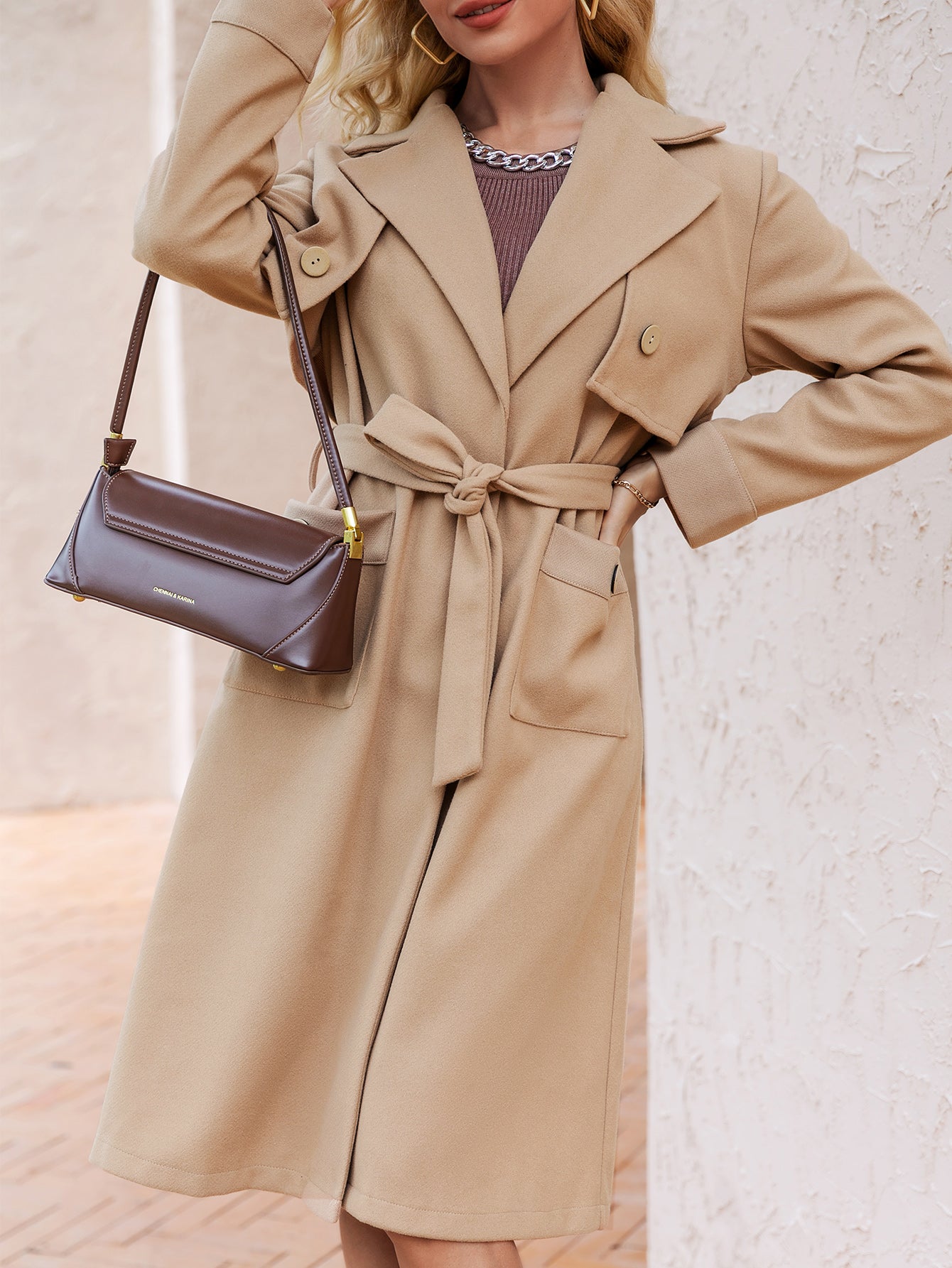 European And American Lapel Belted Pure Color Temperament Slim Coat - Camel / L