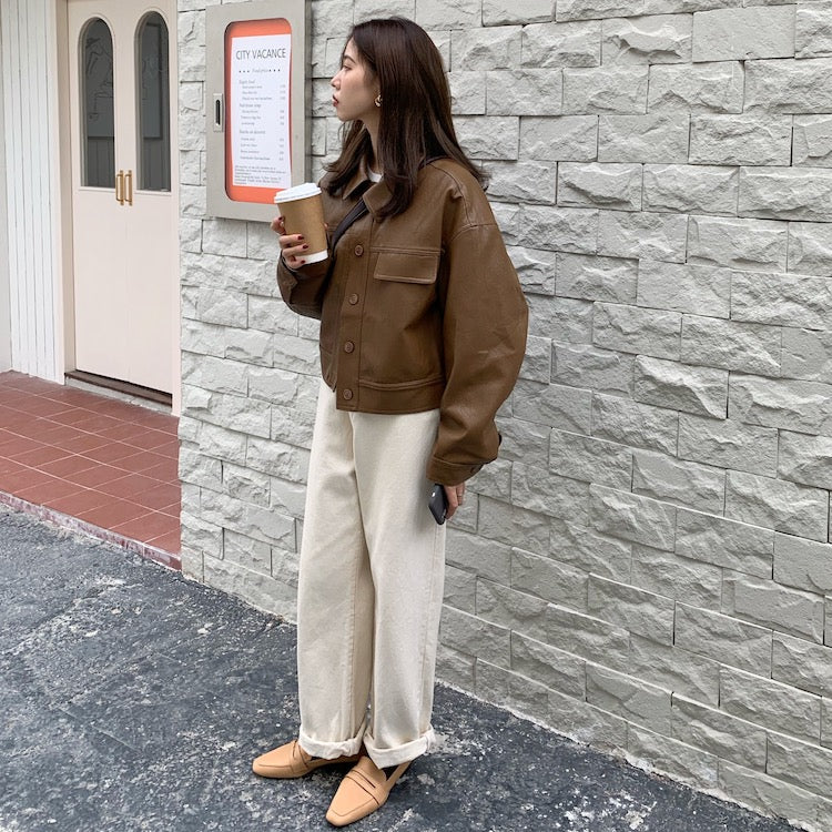 Spring Niche Handsome Lapel Single-Breasted Loose Casual Long-Sleeved Motorcycle Clothing Leather Short Jacket Women - Black