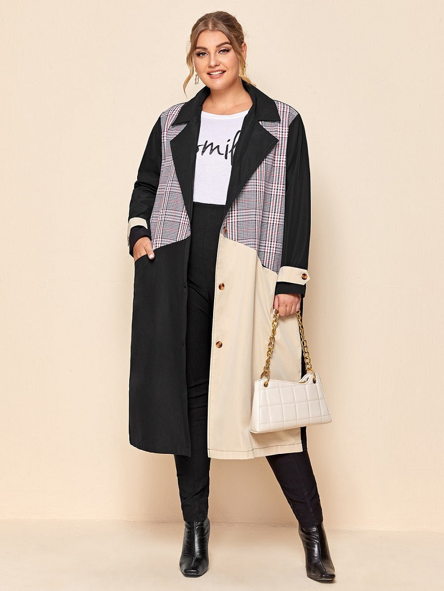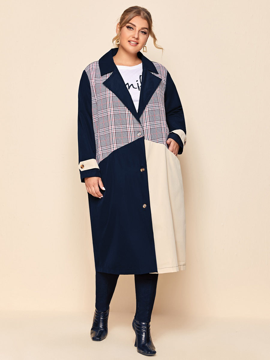 Stitching contrast color mid-length coat ji - Black / 3XL